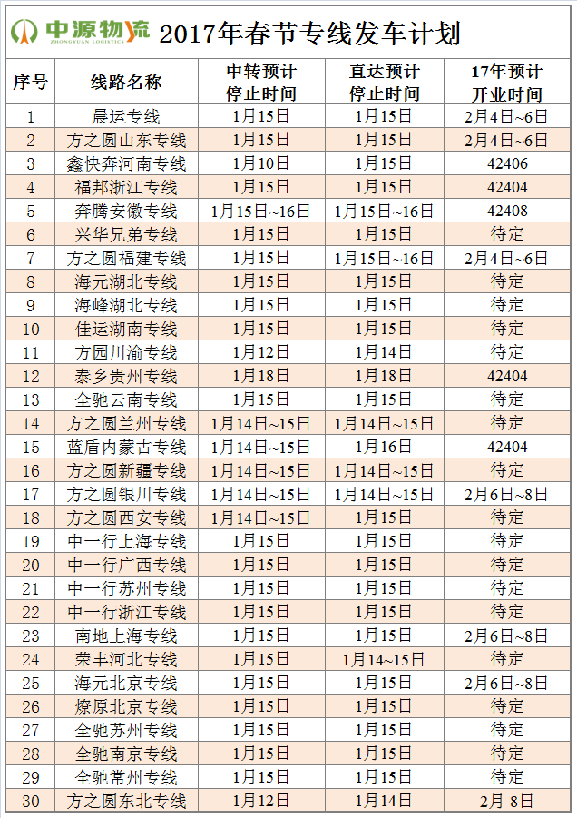 2017年春节将至,根据物流行业的特殊性质和各网点的营业需求,为保障各网点揽收的货物能及时发运,确保各方共度一个欢乐、祥和、平安的新春佳节,现将中源物流各合作专线的最后发车日期初步安排公布如下: